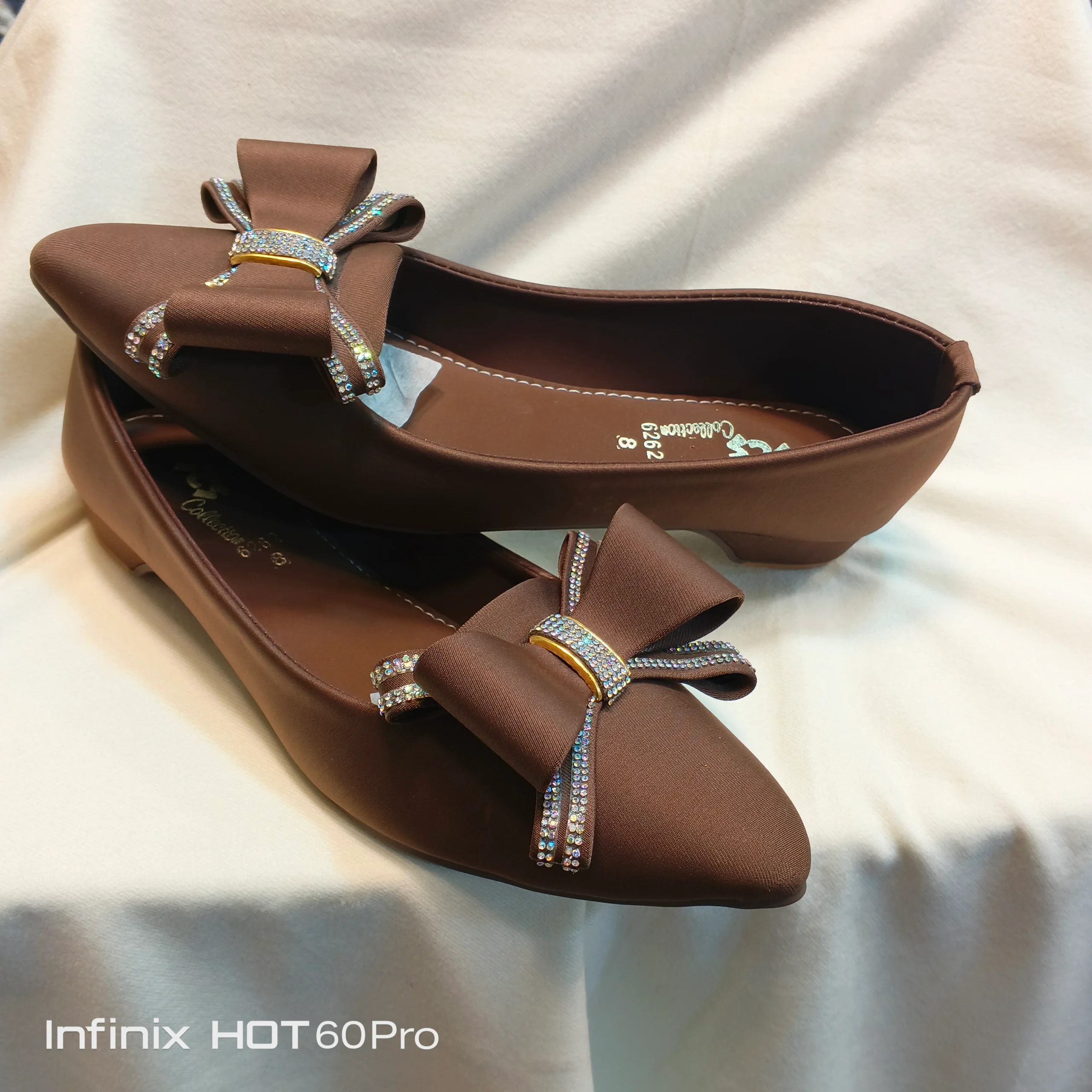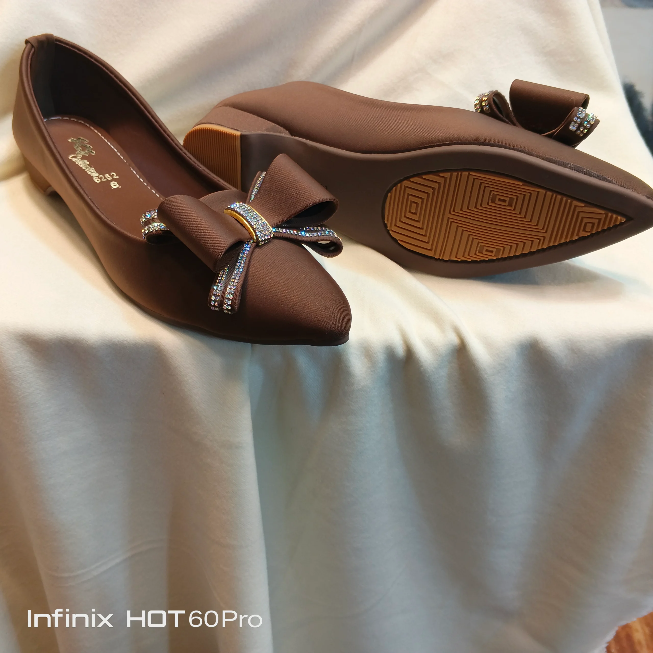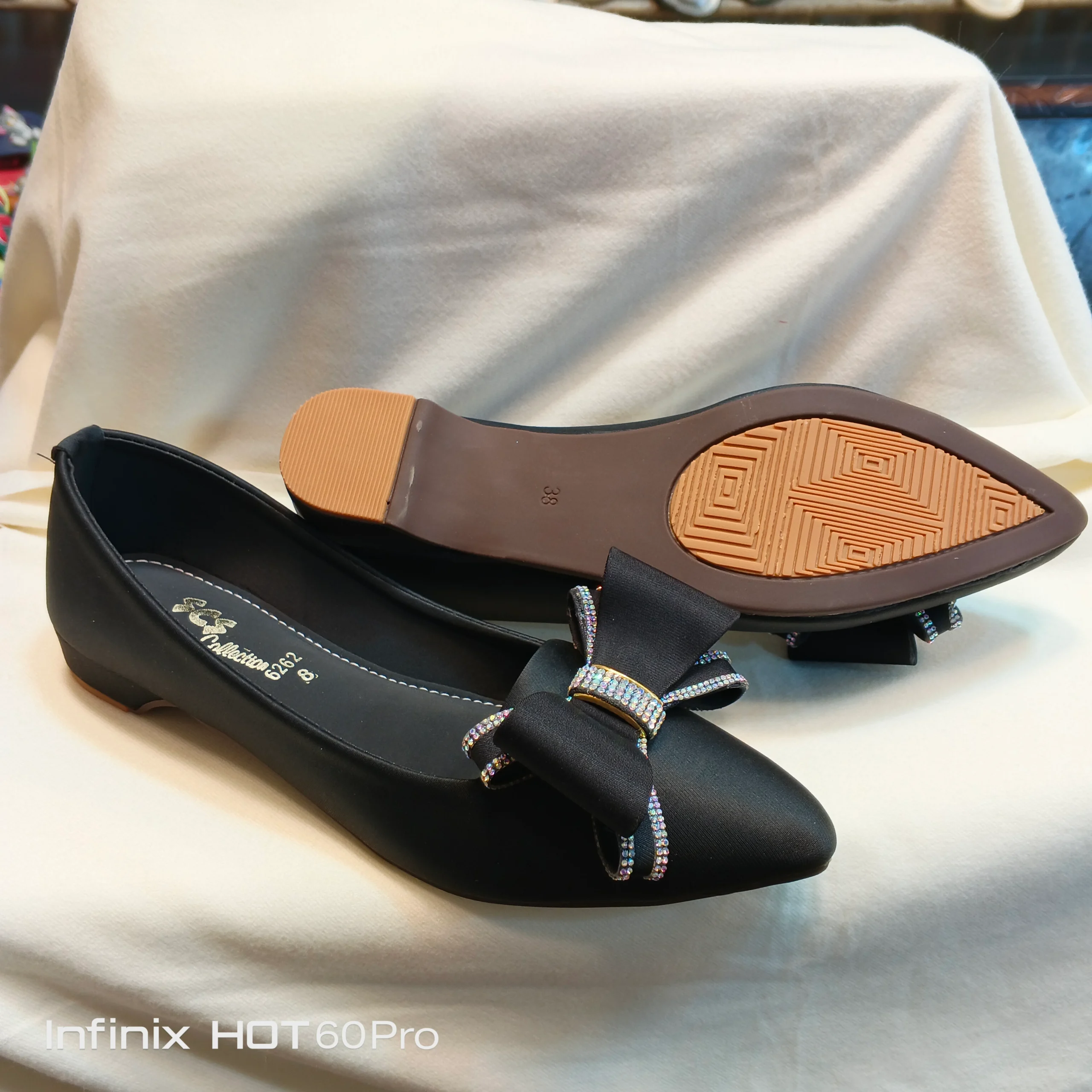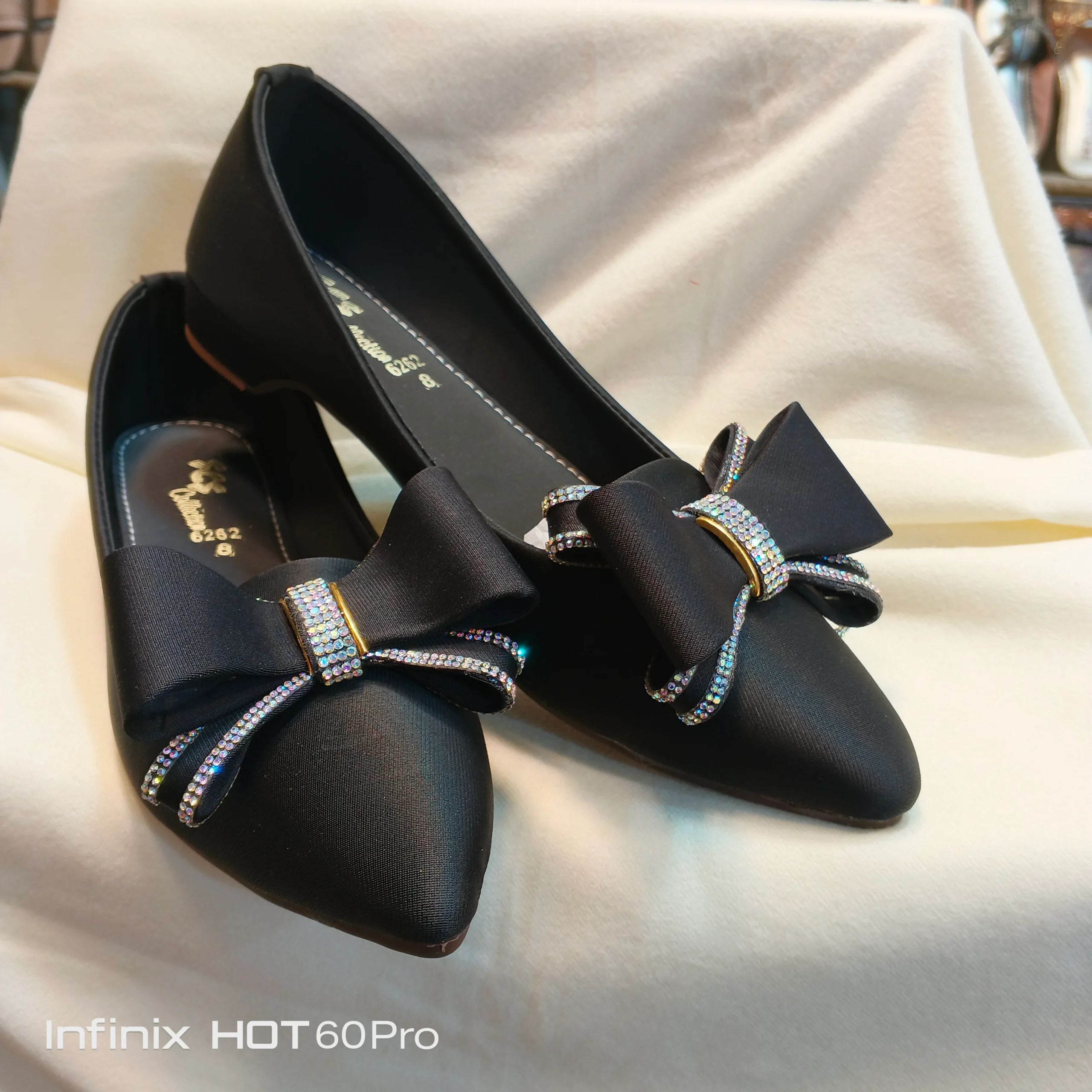 A sleek and elegant classic, these black pointed-toe flats are an essential wardrobe piece. They feature a soft, matte finish and are delicately accented with a sophisticated satin bow. The bow is detailed with vertical lines of multi-colored, subtle rhinestones that catch the light beautifully. The durable, non-slip sole is designed for comfort and extended wear. Ideal for professional settings or formal gatherings.