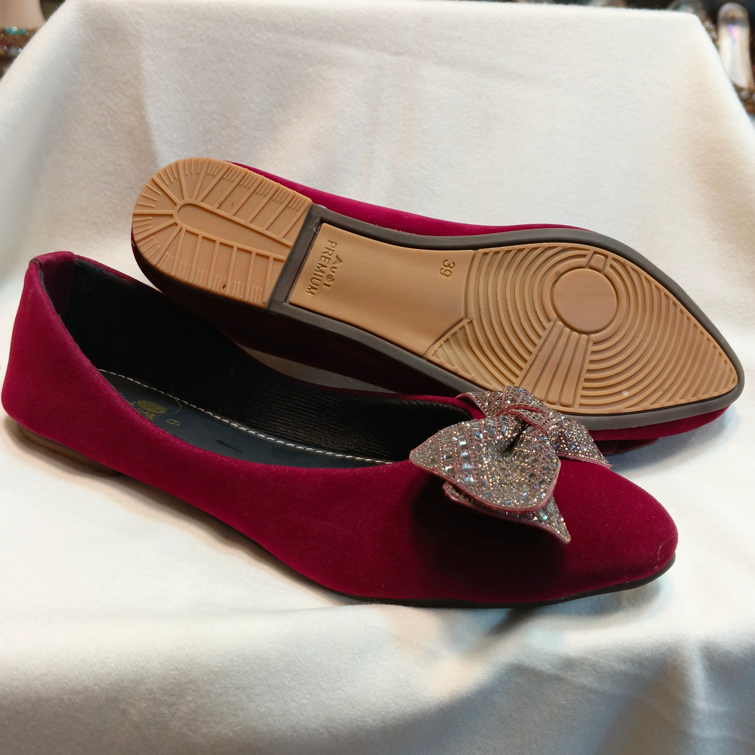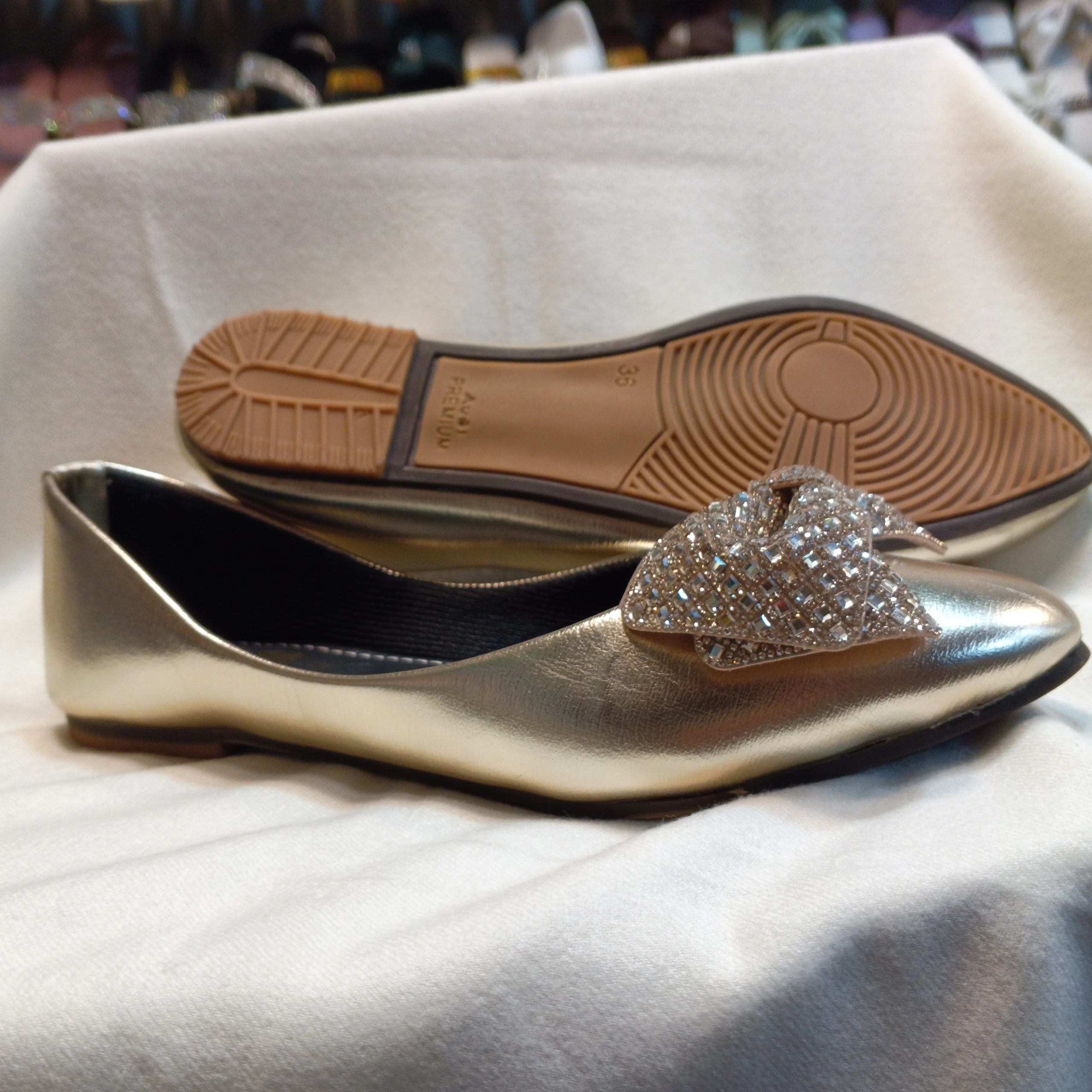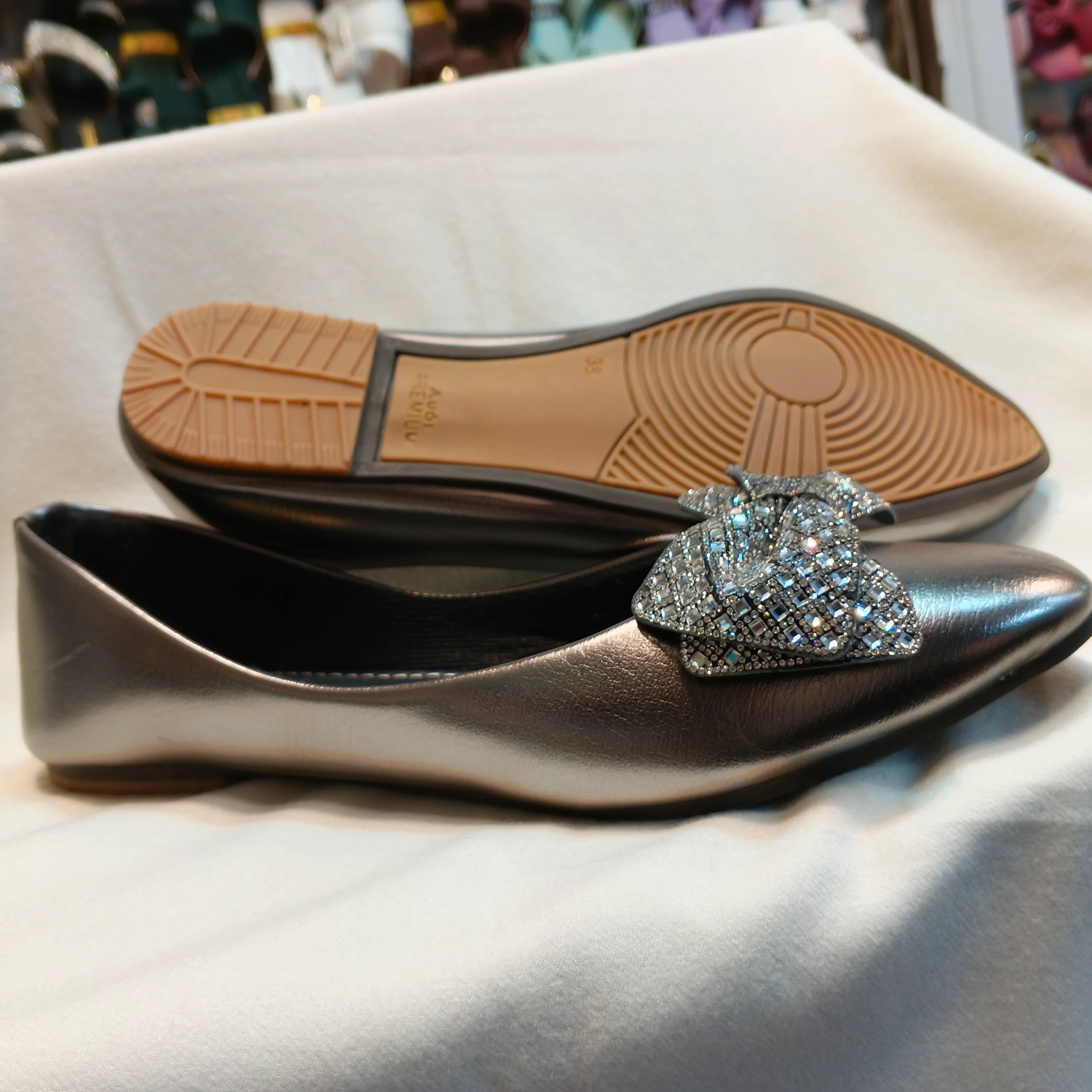 Shine bright with these eye-catching metallic flats! The sleek, modern pewter/gunmetal finish provides a chic base for the show-stopping embellishment: a dramatically oversized bow completely encrusted with shimmering, multi-faceted rhinestones. The soft material and comfortable silhouette ensure you feel as good as you look. A perfect statement piece for parties, weddings, or whenever you want to inject maximum glamour into your ensemble.