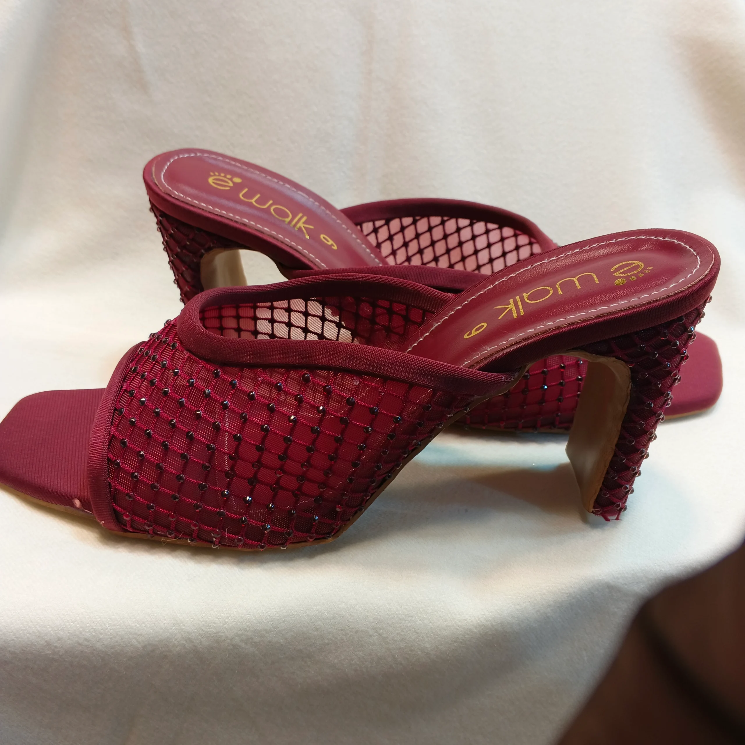 Elevate your evening and party looks with the striking Burgundy Embellished Mesh Block Heel Mules. These elegant slip-on sandals feature a beautiful wine-red or maroon mesh upper, intricately detailed with small sparkling beads that catch the light with every step. The peep-toe style and open back offer a classic mule silhouette, while the solid, mid-height block heel provides both a stylish lift and exceptional comfort for all-day or all-night wear. Perfect as wedding guest shoes, for a festive event, or as chic party heels, this versatile pair is a must-have in your footwear collection. The rich, deep color is ideal for fall, winter, and holiday occasions.